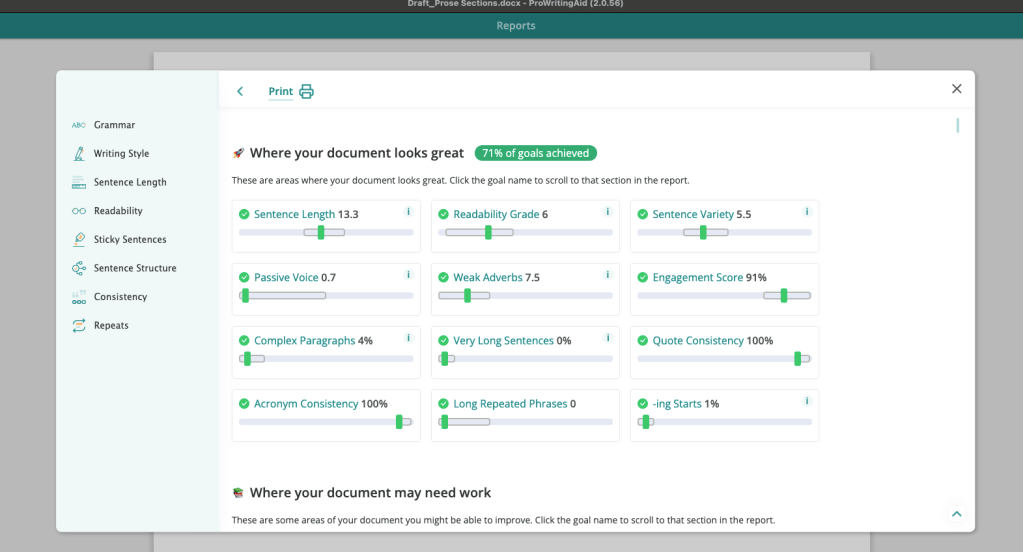 ProWritingAid is my author’s little helper. It is not a replacement for a professional editor, but it is a seriously helpful tool to edit your writing. I also learned so much about my bad habits with this. It has a lot of reports you can run, analyzing your writing to determine overused words, weak words, sticky sentences that are hard to read etc. I really love it and I use it for all of my creative writing.